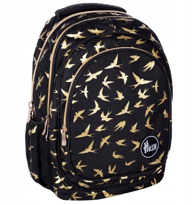 Czarny trzykomorowy plecak Hash z magicznym nadrukiem złotych ptaków. Dzięki niezwykłemu efektowi plecak będzie mienił się w promieniach słońca. Plecak Hash posiada trzy funkcjonalne komory wyposażone w praktyczną kieszonkę oraz organizer na drobiazgi. Wyposażono go również w złote zamki, które przypadną do gustu najmłodszym fashionistkom. Plecak Hash posiada technologię Ergo Back minimalizującą naciski na barki i kręgosłup oraz zapewniającą poczucie komfortu dziecka.