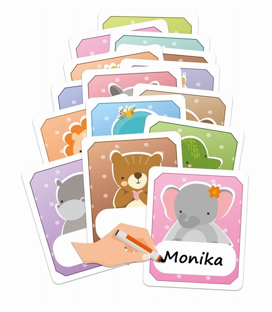 Na każdej karcie znajduje się inne zwierzątko oraz miejsce na wpisanie imienia dziecka.