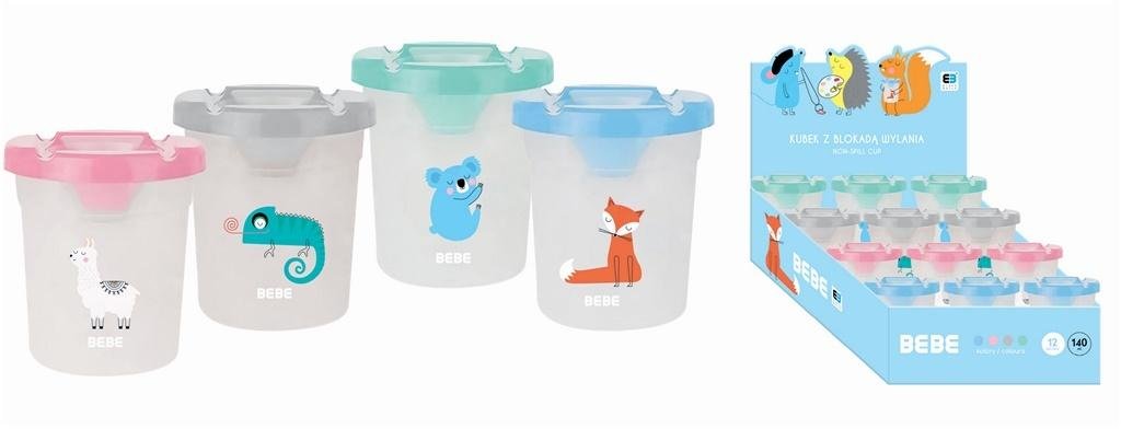 Pojemność: 140 ml. Kubek dla najmłodszych ze specjalną blokadą przeciw wylaniu wody. Praktyczne wgłębienia w pokrywce służą do odkładania pędzli, a dodatkowa zatyczka umożliwi bezpieczne przenoszenie pełnego kubka. Na kubku podobizny zwierzaków BEBE w 4 wzorach - z lamą, koalą, kameleonem lub...