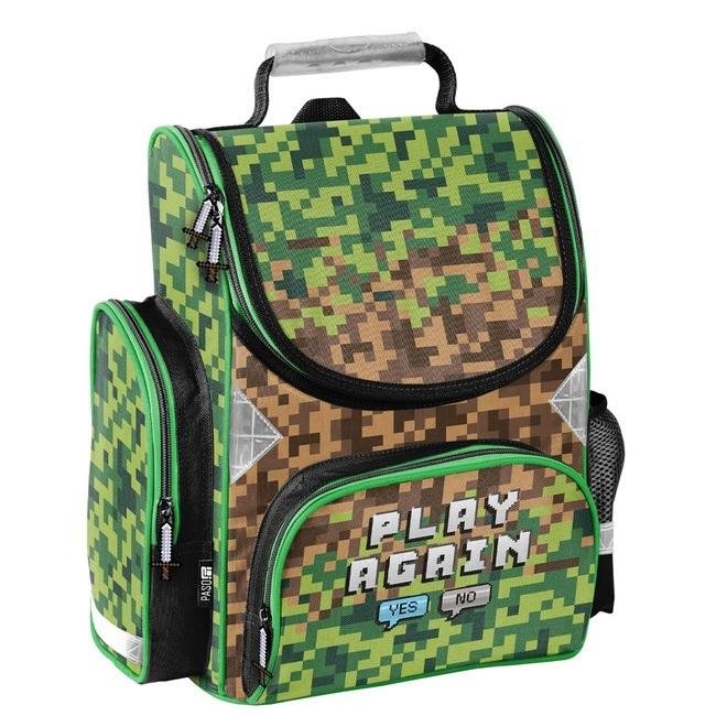 Tornister szkolny. Jedna obszerna komora z wewnętrznym przedziałem. Na przodzie zapinana kieszeń. Dwie kieszenie po bokach: jedna z siatki, druga zapinana na zamek. Ergonomicznie ukształtowane, sztywne plecy. Wygodnie wyprofilowane szelki.