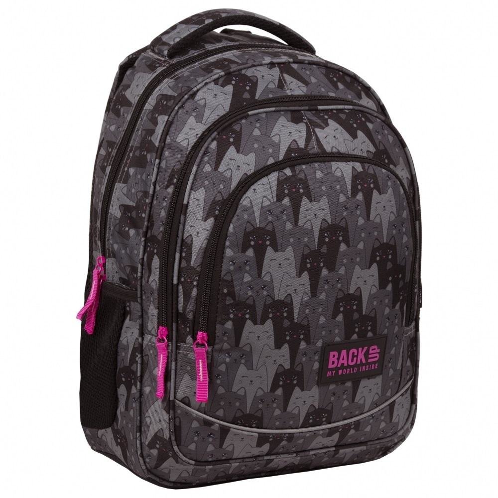 Plecak w koty w odcieniach szarości. Delikatny akcent w postaci różowych nosków i uchwytów przy suwakach oraz logo na naszywce nadają im dziewczęcego charakteru, a zielone oczy odrobiny tajemniczości. Odblaskowa lamówka na froncie. Nazwa wzoru: szare koty.
