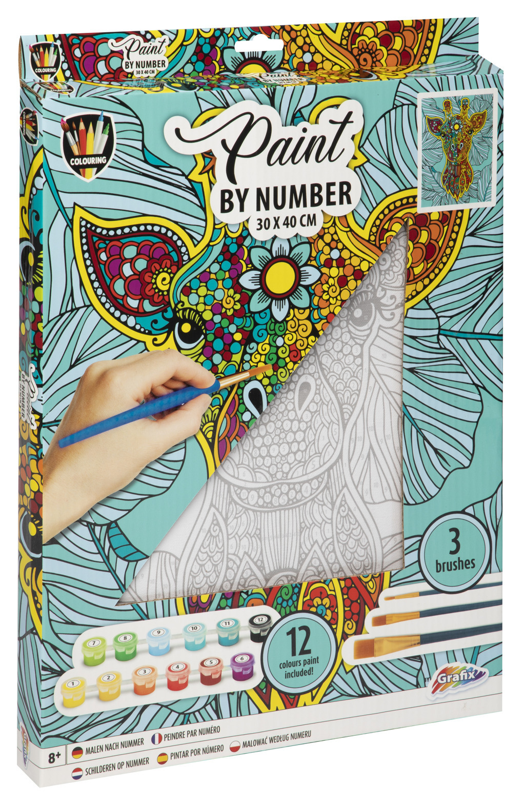 Tento balíček obsahuje bavlněné plátno o rozměru 30×40 cm s předtištěným motivem žirafy, který je rozdělený na jednotlivé oblasti označené čísly. K dispozici je 12 barev speciální akrylové barvy a 3 štětce různé velikosti, díky kterým snadno zvládnete vybarvování i těch nejjemnějších detailů. Vymalováním vznikne nádherný obraz, který můžete vystavit doma, v kanceláři nebo ho věnovat jako originální dárek.