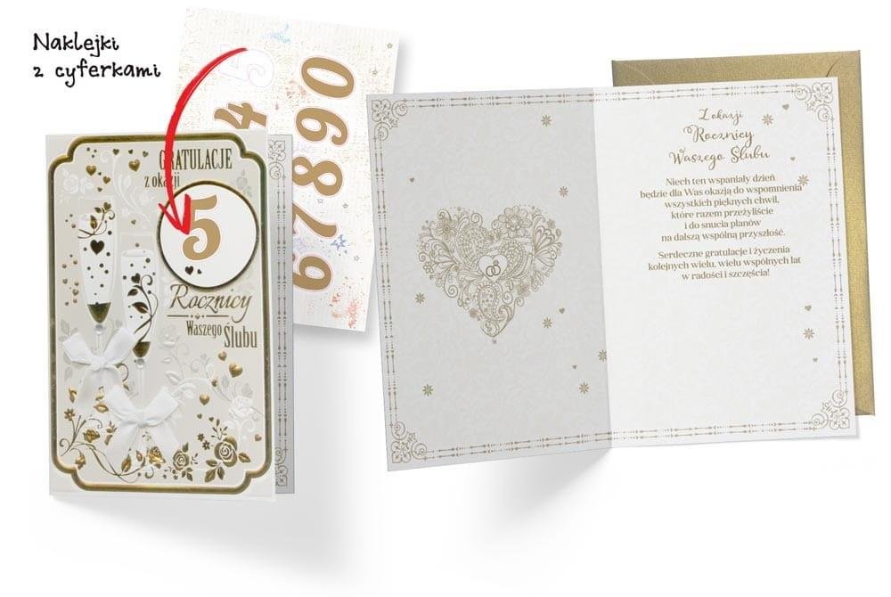 Kartka B6 z ozdobnej serii Dream Cards na Rocznicę Ślubu - nieduża, ale robi wrażenie dzięki atrakcyjnej kolorystyce i ciekawym zdobieniom. To idealny wybór łączący przyjazną cenę z jakością. Kartki z tej serii mają wyjątkowy dodatek - naklejki z cyferkami, z których można ułożyć dowolną liczbę reprezentującą ilość wspólnie spędzonych lat.. Cechy szczególne: wielkość: B6, 16.6 x 11.7 cm po złożeniu, koperta: w zestawie, kolorowa, zdobienia: różnorodne, bogate (w zależności od wzoru: przyklejane dekoracje, elementy biżuteryjne, odstawniki, brokat metaliczne folie, tłoczenia itp.), okazja: Rocznica ślubu