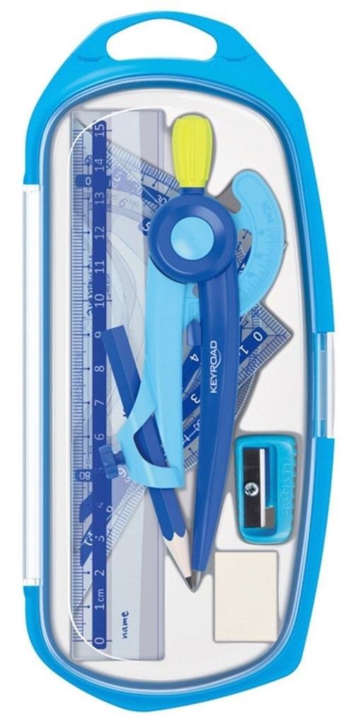 zestaw duży: cyrkiel, linijka, kątomierz, ekierka, temperówka, gumka