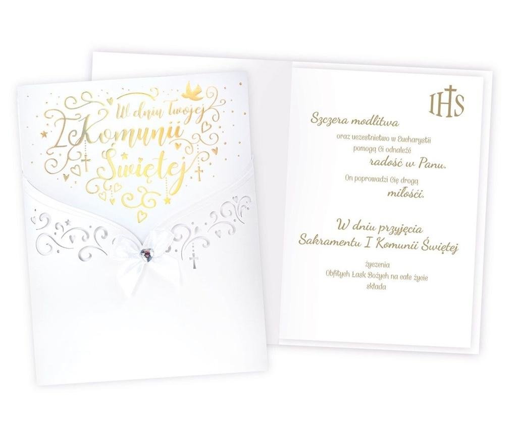 Kartki z serii Primus, to kartki najwyższej jakości, pięknie zdobione m.in złotą lub srebrną folią,tłoczeniami, czy wycinkami laserowymi. Idealne na najważniejsze okazje w życiu, takie jak ślub, komunia. W środku każdej kartki znajdują się dobrane do okazji życzenia, a do kartki dołączona jest dopasowana koperta. Cechy szczególne: wielkość: niestendardowa, prostokątna, kwadratowa, zdobienia: dekoracje ze złotej folii, doklejane koraliki, tłoczenia koperta: dopasowana w komplecie, wnętrze kartki: życzenia w środku, okazja: komunia.