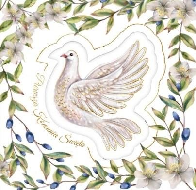 Składany z trzech stron kwadratowy karnet o wymiarach 15 x 15 cm z wyciętym elementem na froncie. Złocony i tłoczony, teksy życzeń w środku. Wydrukowany na wysokiej jakości papierze. W zestawie koperta.