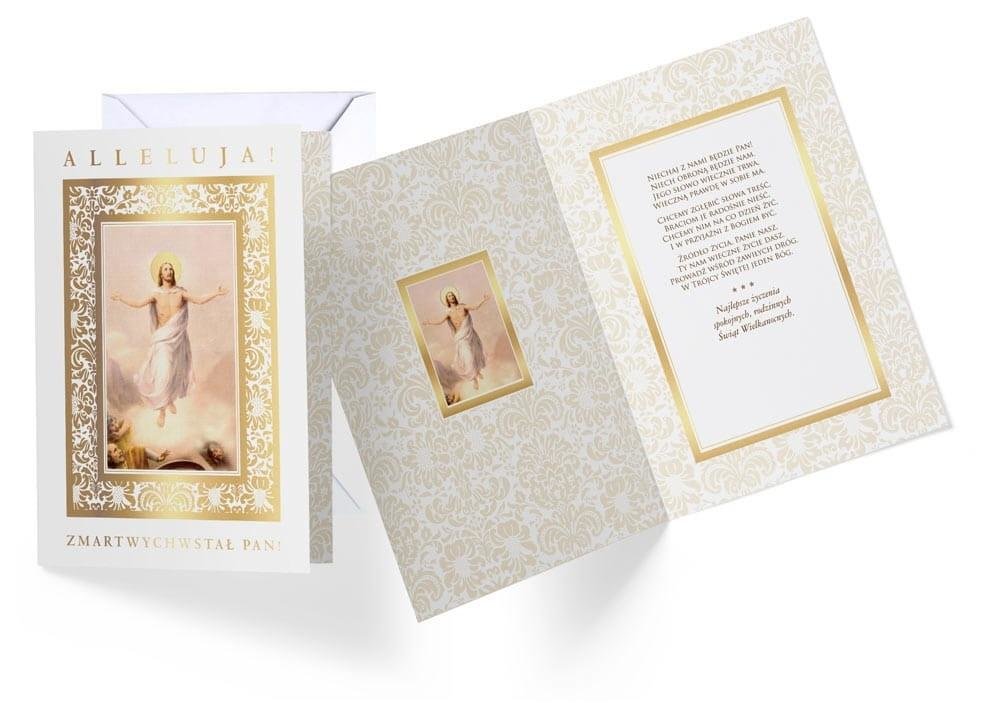 Karnet Wielkanoc Kartka wielkości B6. Karnet wielkanocny, posiada delikatne złote zdobienia. Kartka posiada tekst w środku, dołączona jest do niej koperta.