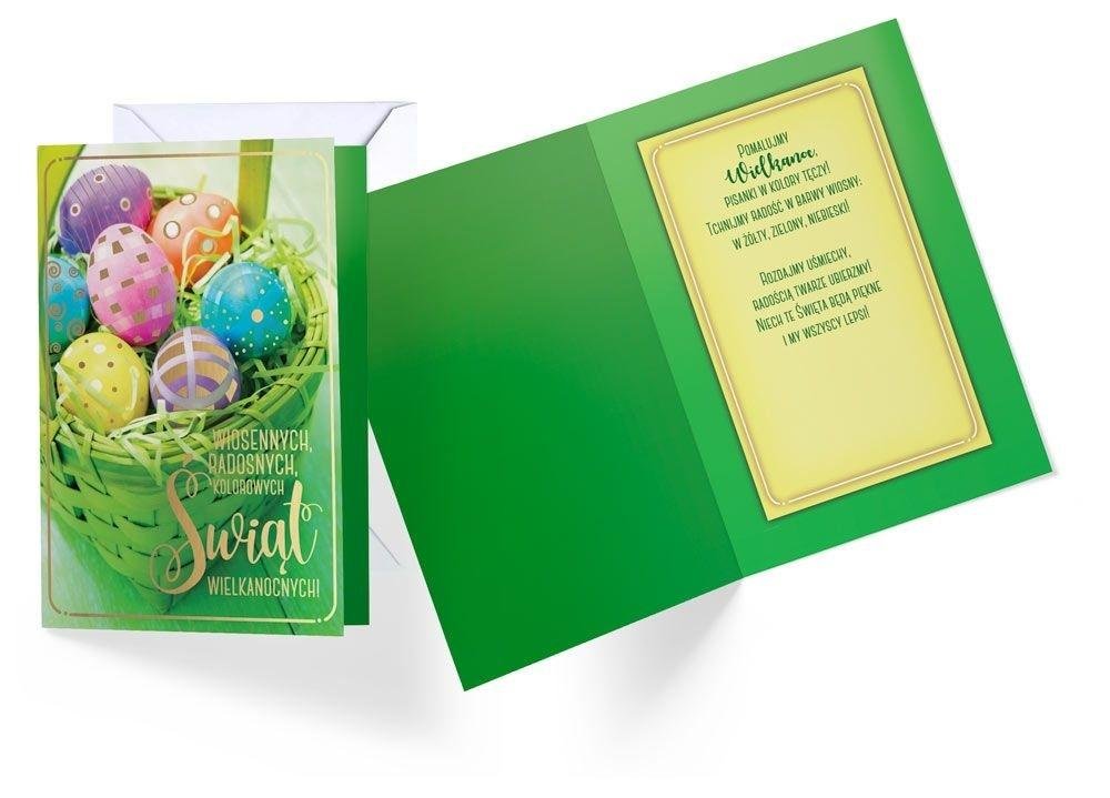 Karnet wielkanocny, posiada delikatne złote zdobienia. Kartka posiada tekst w środku, dołączona jest do niej koperta. číst celé