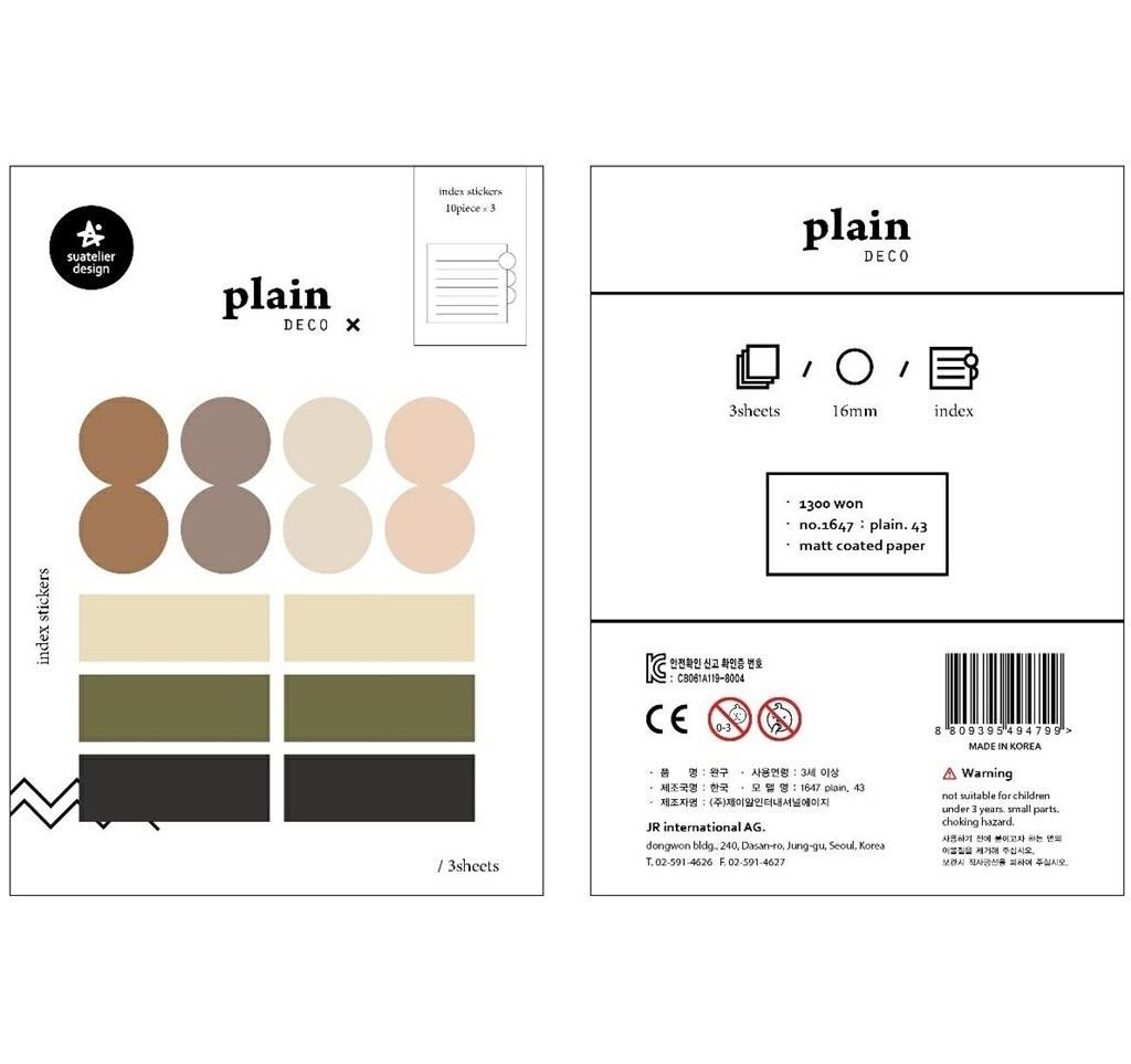 Seria Suatelier Plain to kolekcja prostych i eleganckich naklejek, idealnie nadających się do ozdabiania notesów, kalendarzy, telefonów czy innych przedmiotów. Rewelacyjnie sprawdzą się również jako znaczniki lub naklejki motywacyjne. Te naklejki pozwalają na dodanie subtelnego akcentu do Twojego stylu i są dostępne w różnych kolorach i rozmiarach. Naklejki wykonane z matowego powlekanego papieru. Wymiar arkusza 9,5x13 cm."