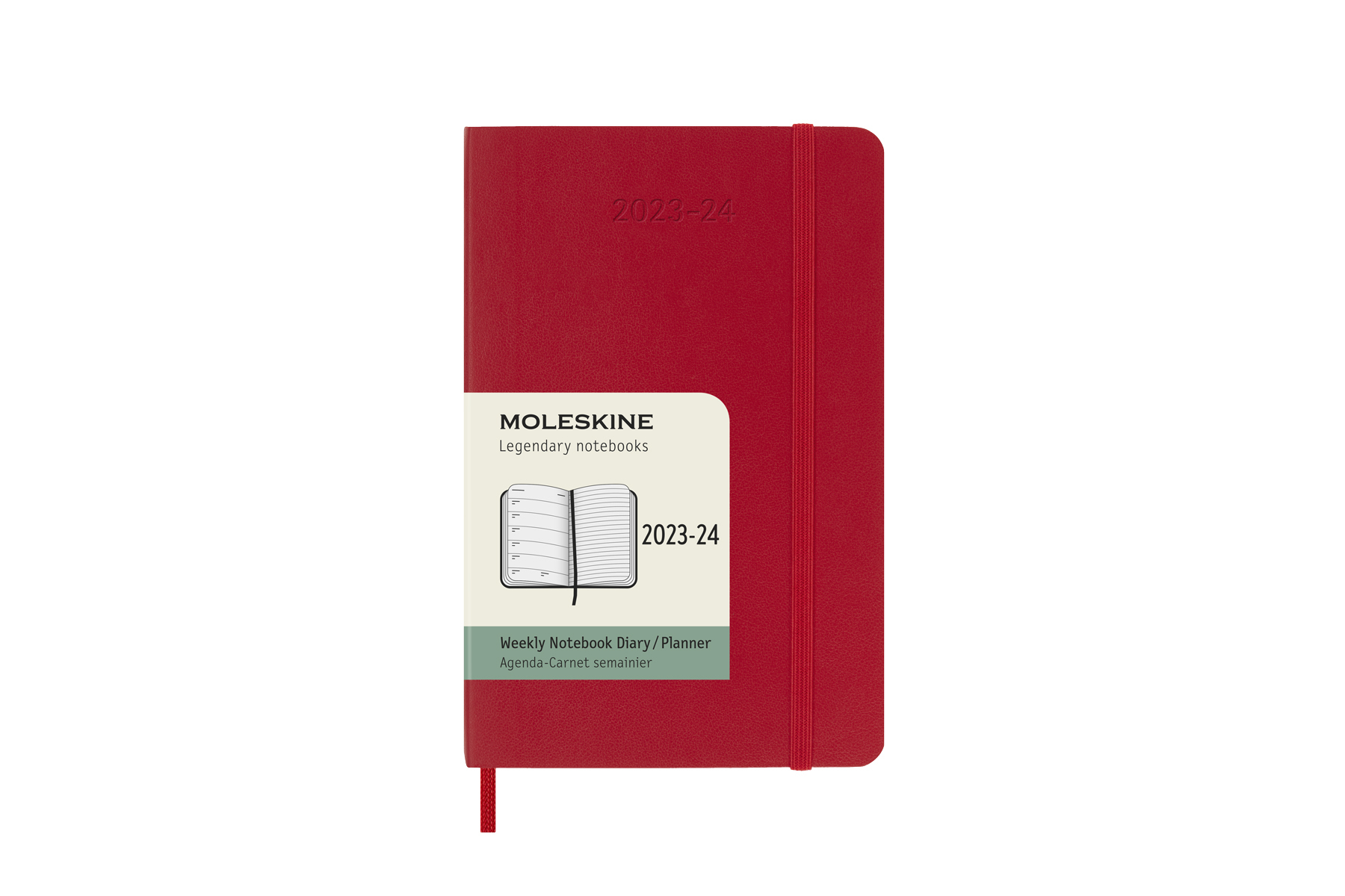 Červený plánovací zápisník kapesní velikosti na rok 2023-24. Diář je datovaný od července 2023 do konce roku 2024. Na levé straně jsou dny v týdnu a na pravé linkovaná stránka na poznámky. Diář má měkkou vazbu v kartonových deskách. Obepíná ho pružná páska proti samovolnému otevírání. Obsahuje praktickou vnitřní kapsu, textilní záložku a barevné samolepky. Papír s gramáží 70 g/m2 neobsahuje kyseliny.