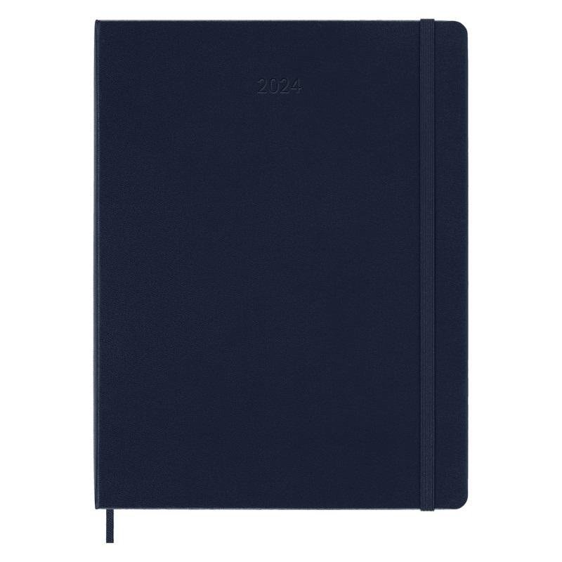 Extra velký modrý plánovací zápisník na rok 2024. Na levé straně jsou dny v týdnu a na pravé linkovaná stránka na poznámky. Zápisník má tvrdou, ve hřbetu šitou vazbu. Obepíná ho pružná páska proti samovolnému otevírání. Obsahuje praktickou vnitřní kapsu, textilní záložku, 3 sady samolepek a 1 sadu samolepek s letopočty. Papír s gramáží 70 g/m2 neobsahuje kyselin.