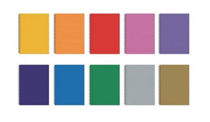 Wykonany z tektury 1,5 mm. Okleina uszlachetniona folią polipropylenową w kolorach pastelowych. Spirala zamontowana na dłuższym boku brulionu, kartki 60 g z perforacją i otworami do segregatora.Kolor wysyłany losowo číst celé