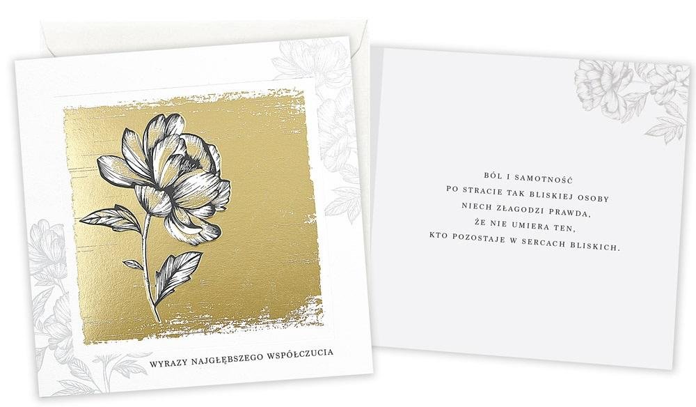 Kartka z serii Quadro z kondolencjami. Kartki wyróżniają się nowoczesnym designem przedstawionym w prostej formie. Środek kartki posiada specjalny tekst. Całość idealnie dopełnia koperta zaprojektowana z dbałością o każdy detal pasujący do kartki. Cechy szczególne: wielkość: 15.5 x 15.5 cm po złożeniu koperta: stylistycznie dopasowana do kartki zdobienia: połyskująca folia