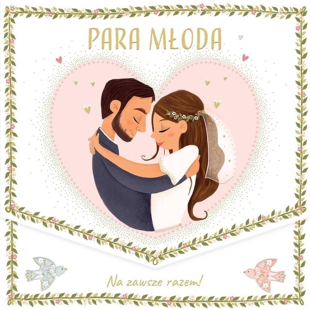 Karnet kwadratowy z kieszonką na, składany z trzech. Złocony i tłoczony, teksy życzeń w środku. Wydrukowany na wysokiej jakości papierze. W zestawie koperta.