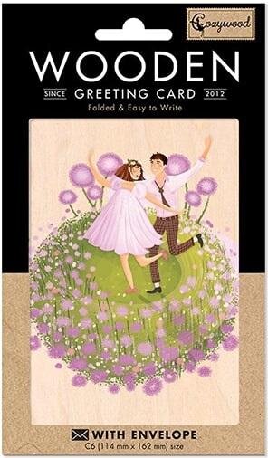 Drewniany karnet w formacie C6 z kopertą. W środku nie zawiera tekstu. Ten karnet jest w 100% biodegradowalny, wykonany przy użyciu minimalnego nakładu energii, gazu i wody. Jego wytworzenie zużywa 5 razy mniej drewna niż wykonanie karnetu papierowego. Wyprodukowany na Litwie.