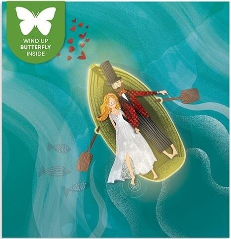 Karnet w formacie kwadratu (15x15cm) z niespodzianką. Po otwarciu karnetu wylatuje z niego papierowy motylek. Wspaniała niespodzianka dla osób poszukujących oryginalnego i efektownego prezentu. Do karnetu dołączona jest instrukcja obsługi. Wyprodukowany na Litwie.