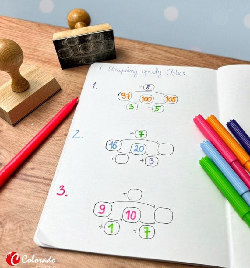 Do nauki, ćwiczenia i doskonalenia działań matematycznych w łatwy i przyjazny dla dziecka sposób. Wystarczy odbić pieczątkę i zapisać działanie.