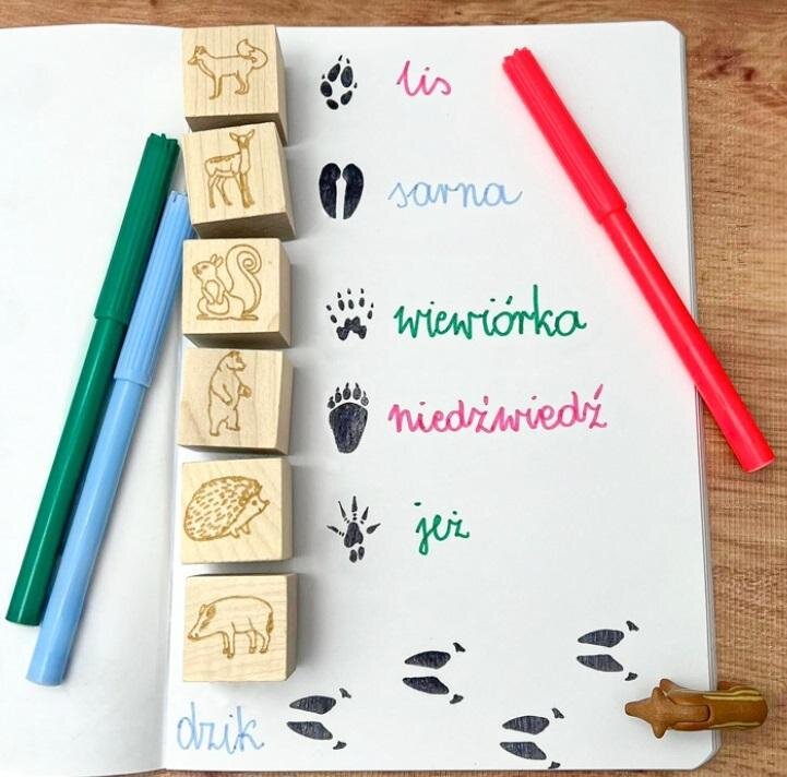 Zestaw zawiera 6 stempli z wizerunkiem: lisa, sarny, wiewiórki, niedźwiedzia, jeża oraz dzika.