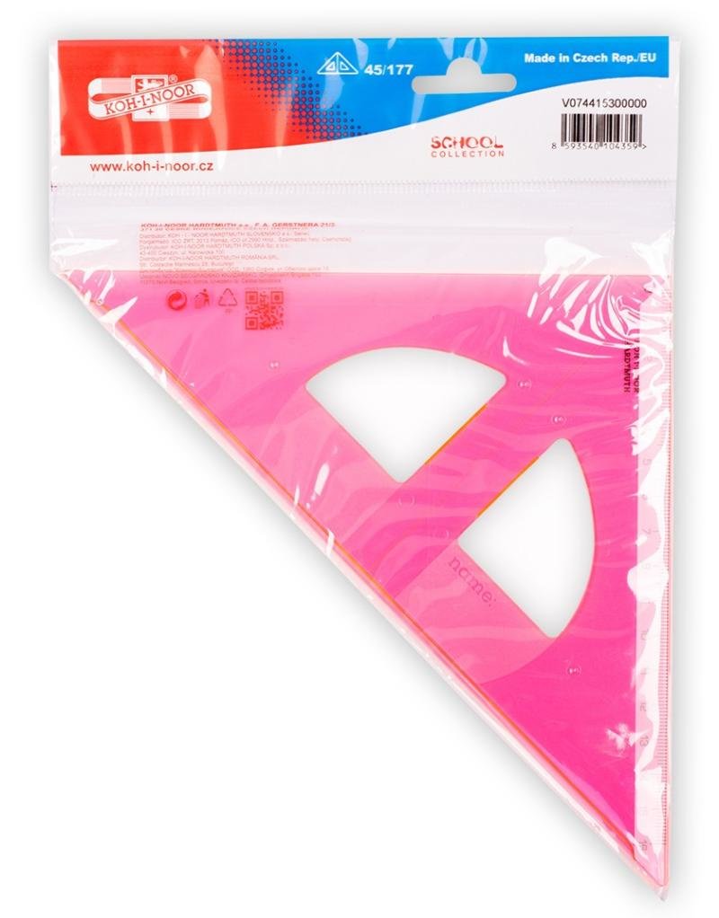 Trojúhelník 45/177 s kolmicí vyrobený z růžového průhledného polystyrenu. Stupnice je naražena technologií horké ražby. Přesnost stupnice 0,2% délky. Mimo délkové stupnice je vybaven i ryskou pro konstruování kolmic. Trojúhelník je určený k rýsování a technickému kreslení ve škole i v kanceláři. Zabalen je do polyetylenového sáčku s eurozávěsem.