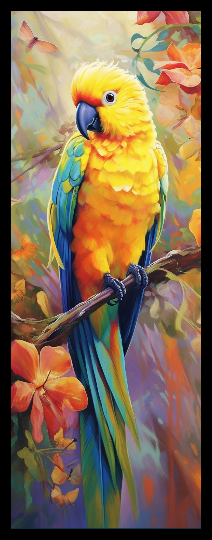 Záložka z oblíbené série Papoušci zachycuje malebnou scenérii, kde papoušek sedí na větvi, obklopený rozkvetlými oranžovými a růžovými květy, které dodávají celému motivu živost a šarm. Papoušci jsou známí svou schopností vyjadřovat emoce - od třepotání křídel po naklánění hlavy - a tato záložka přináší do vašeho čtení nejen eleganci, ale i nádech přírody.