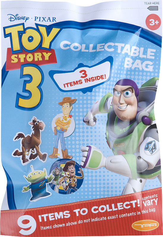 Překvapení z filmu Toy Story, balení obsahuje 3 hračky z filmu, na zadní straně sáčku je vyobrazeno všech 9 hraček v kolekci.