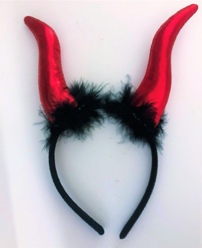 Čertovské rohy na čelence. Materiál: textil + plast Délka rohu cca 12 cm Barva: červená s černým peřím číst celé
