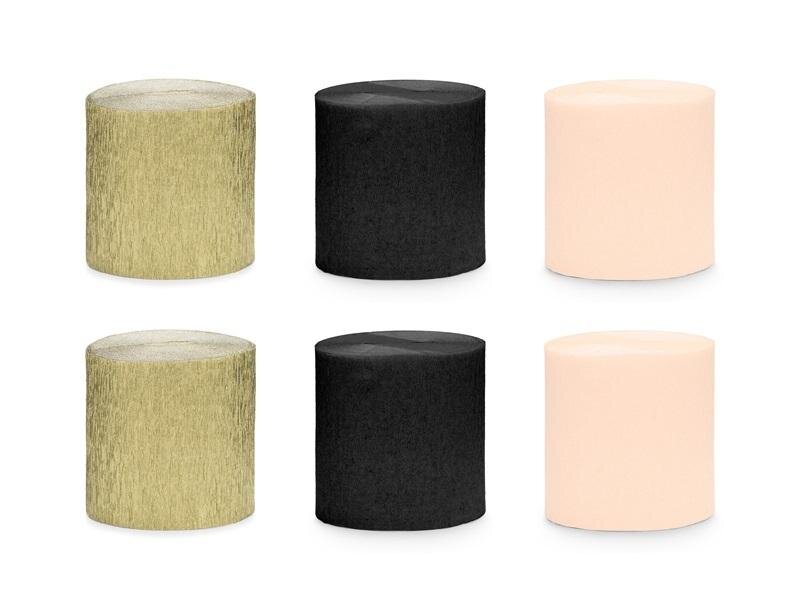 Krepa w kolorach brzoskwiniowych, czarnych i złotych, 6 sztuk, szerokość ok. 5 cm, długość ok. 10 m/rolkę(1 op. / 6 szt.)