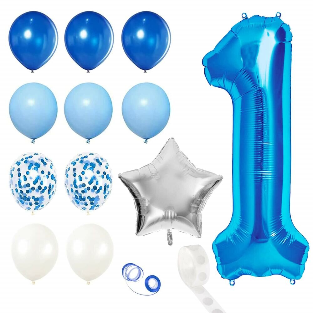 Sada narozeninových balónků 1, modré je perfektní dekorací pro nezapomenutelnou oslavu prvních narozenin. S touto bohatou sadou získáte vše, co potřebujete k vytvoření radostné a barevné atmosféry, která potěší nejen dítě, ale i všechny přítomné hosty.