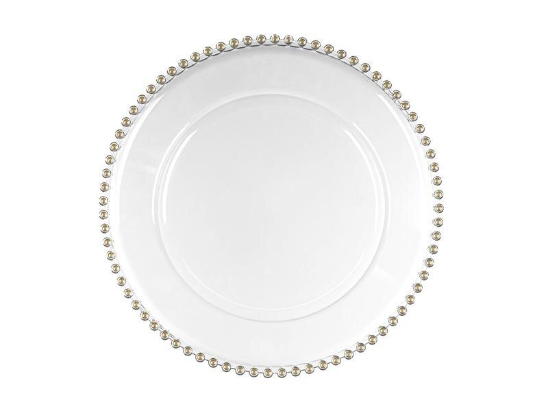 Podtalerz z perłami wykonany z transparentnego plastiku, średnica ok. 32 cm i głębokość 3 cm. číst celé