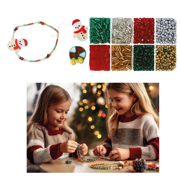 Tato kreativní sada obsahuje 1100 korálků v tradičních vánočních barvách - červené, zelené, zlaté, stříbrné i metalické odstíny - a také tematické plastové přívěsky, jako je sněhulák nebo vánoční věnec. Sada je ideální pro výrobu vlastních náramků, ozdob nebo drobných dárků, které potěší každého.