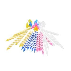 Kolorowe świeczki urodzinowe o wysokości 6 cm. Świeczki do dekoracji tortu w czterech kolorach: białe, żółte, niebieskie oraz żółte. Wyposażone w podstawki umożliwiające stabilne i łatwe umieszczenie świeczki na torcie. Podstawki z rantem ograniczającym spływanie wosku podczas palenia się świec na ciasto. Komplet zawiera 24 świece oraz 12 podstawek.