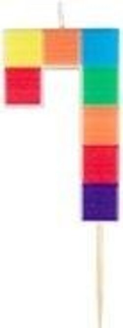 Świeczka urodzinowa w kształcie cyfry 7 z motywem kolorowych klocków. Idealna jako dopełnienie dekoracji tortu. Posiada element umożliwiający stabilne wbicie świeczki w ciasto. Wysokość świeczki to 7 cm.