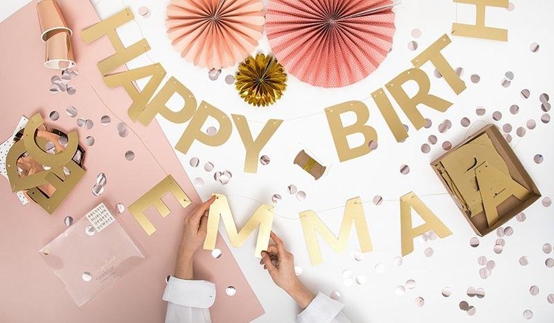 Baner Alfabet wykonany z papieru w kolorze złotym. Set składa się z 4 liter A i E, 3 liter B, D, H, O, P, R, S, Y, 2 liter C, F, G, I, J, K, L, M, N, T, U, V, W, X, Z, 1 litery Q i 8 m złotego sznurka. Wysokość liter ok. 14 cm.(1 op. / 63 szt.)