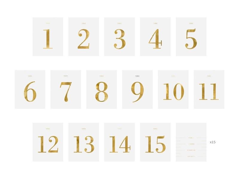 Numery na stół w formie naklejek na butelkę, wykonane z białego samoprzylepnego papieru ze złotym nadrukiem, zestaw zawiera numery od 1 do 15 oraz 15 miarek, wymiary ok. 9,5 x 12 cm.(1 op. / 30 szt.) číst celé
