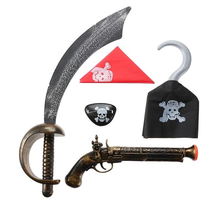 ZESTAW DZIELNY PIRAT (Z HAKIEM) W skład zestawu wchodzą: szabla, pistolet, hak, opaska na oko, bandana Długość szabli: 48 cm Długość pistoletu: 28 cm Długość haka (z materiałem): 23 cm Materiał: plastik číst celé