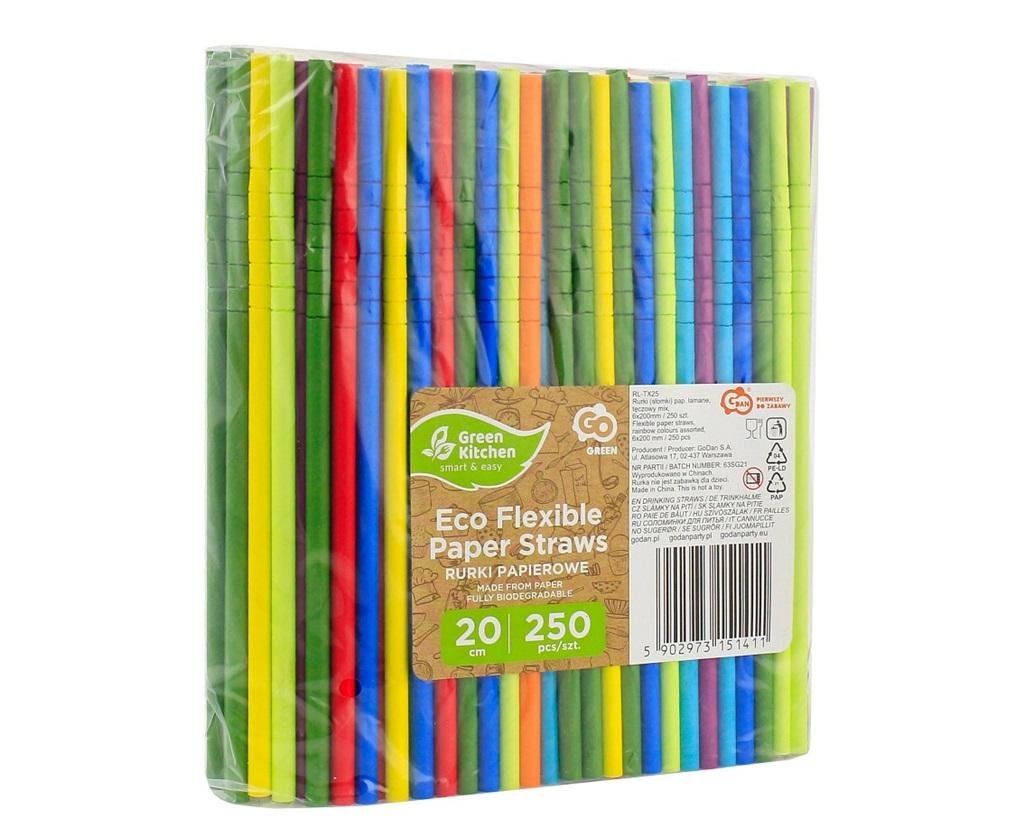 PAPIEROWE SŁOMKI DO PICIA ŁAMANE, WIELOKOLOROWE Długość: 20 cm Średnica: 0,6 cm Kolor: wielokolorowe Materiał: papier Ilość sztuk w opakowaniu: 250 Kolekcja: GoGreen