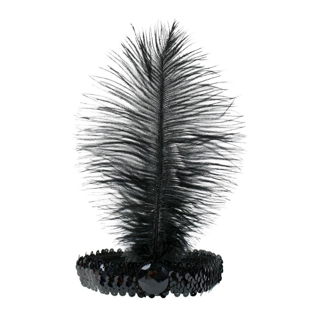 Elastická černá čelenka s jemnými flitry, ozdobená peřím a výrazným barevným kamenem, je perfektní volbou pro každou ženu, která chce dodat svému outfitu půvab a eleganci ve stylu charleston.