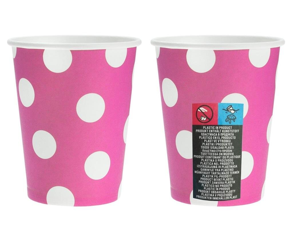 Papierowe kubeczki w kolorze magenta z białymi groszkami.