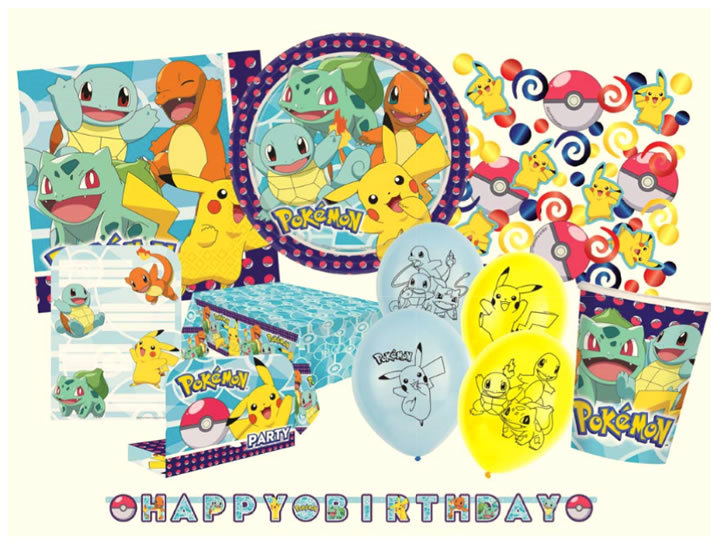 Party set velký Pokémon obsahuje kelímek 8 ks, talířek 23 cm 8 ks, ubrousky 20 ks, pozvánky 8 ks , svíčky sada 4 ks, banner, ubrus, party čepice 8 ks