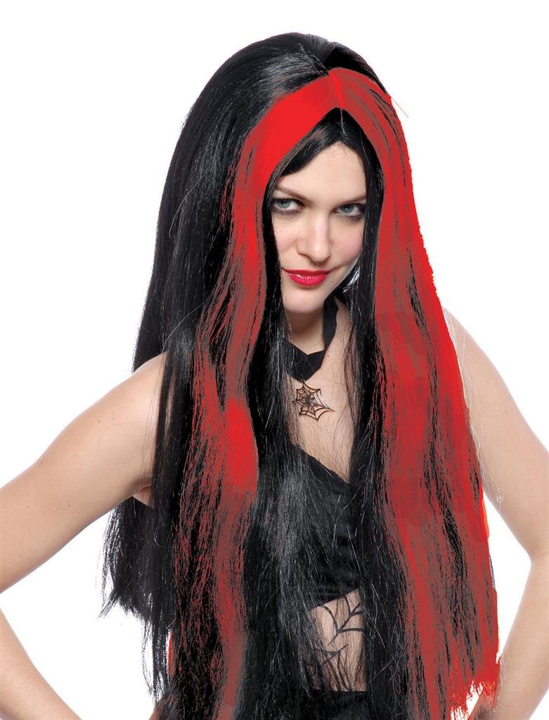 Černá paruka s červenými pramínky, ideální ke kostýmu čarodějnice.Barva: ČernáHmotnost: 0,288 Kg číst celé