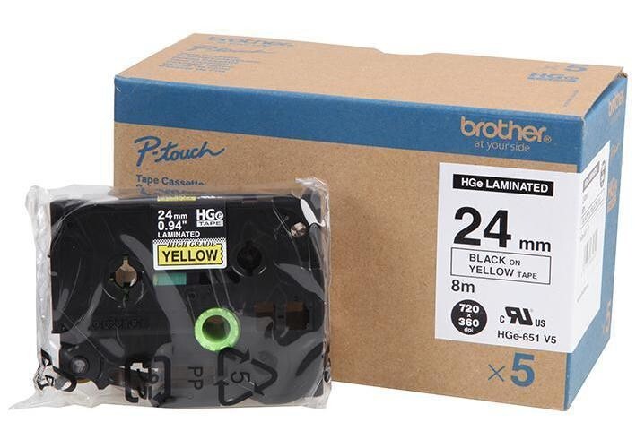 Brother HGe-651, 24mm x 8m, 5ks, černý tisk / žlutý podklad, originální páska