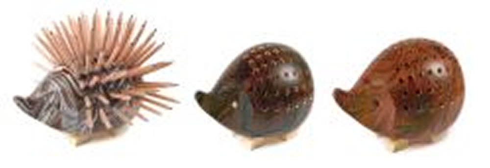 Plný dřevěný stojan na tužky ve tvaru ježka. Délka 240 mm, průměr 150 mm, výška s nožičkami 150 mm. 84 otvorů na tužky o průměru 8 mm. 84 polovičních pastelek.