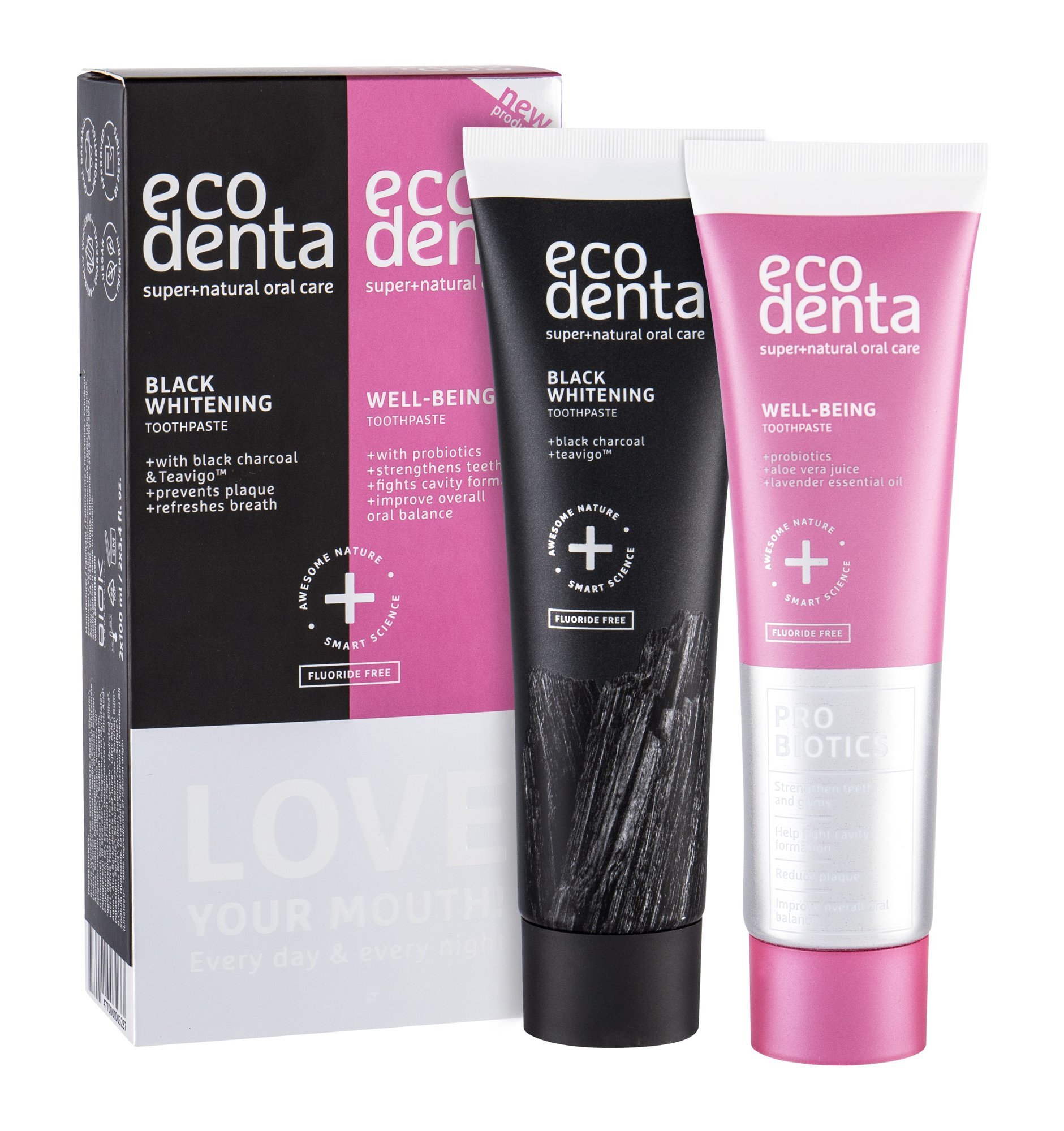 Pečujte o své zuby a dásně se zubními pastami **Ecodenta** z dárkové kazety **Love Your Mouth**. ### Jaké druhy zubní pasty Ecodenta v sadě naleznete? **Bělicí zubní pasta Black Whitening 100 ml** Černá zubní pasta **Ecodenta Black Whitening Toothpaste** pro dokonale bílé zuby obsahuje černé uhlí a extrakt ze zeleného čaje. V ústech vytváří šedivou pěnu, která jemně bělí zuby a osvěžuje ústní dutinu. Zabraňuje tvorbě zubního plaku, kamene a má silný antibakteriální účinek. **Zubní pasta Well-Being 100 ml** Zubní pasta **Ecodenta Toothpaste Probiotics Well-Being** obsahuje probiotika, šťávu z aloe vera a velké množství přírodních složek, díky kterým posiluje zuby a dásně. **Použití:** Naneste pastu na navlhčený kartáček a čistěte zuby.