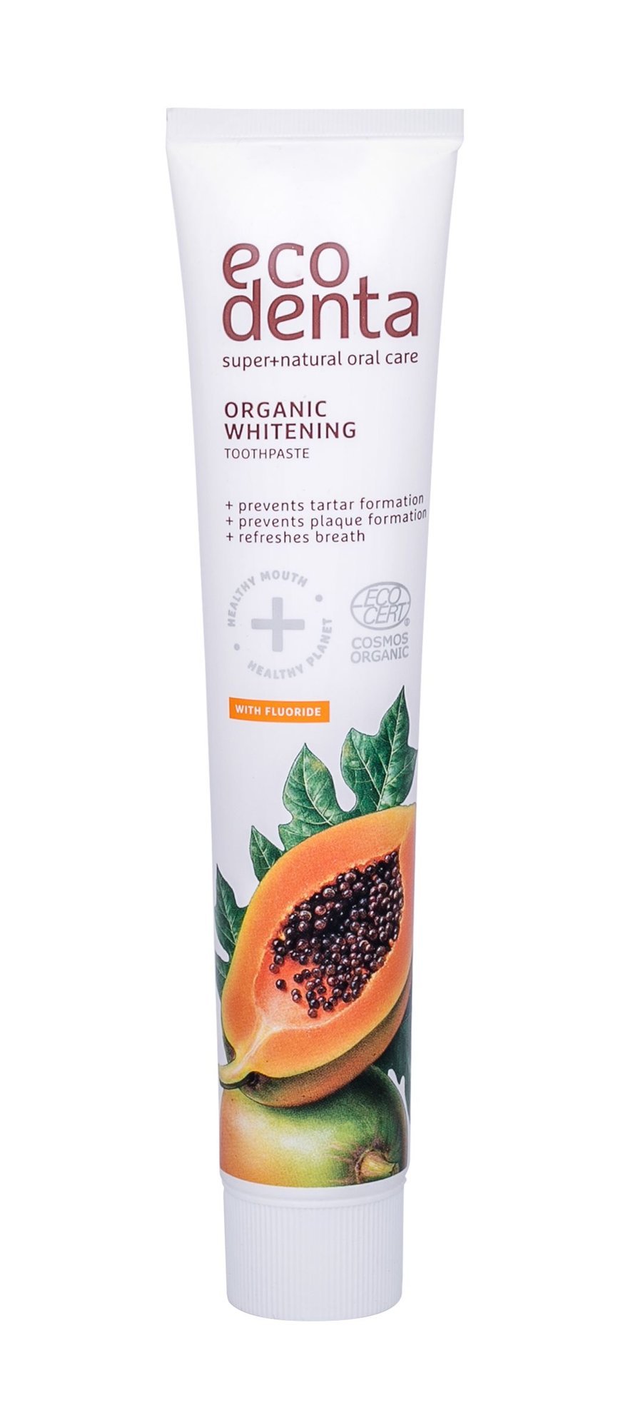 Organická zubní pasta **Ecodenta Organic Papaya Whitening** s certifikovanou ovocnou formulí **vybělí vaše zuby pomocí přírodních látek**, které tvoří výtažek z papáji, aloe vera, xylitol (březový cukr) a peprmintový olej. ### Užijte si bílé zuby bez chemie se zubní pastou Ecodenta Organic Papaya. * obsahuje 99% složek přírodního původu, * **šetrně bělí zuby,** * předchází tvorbě zubního plaku a kamene, * svěží peprmintová vůně osvěžuje celou ústní dutinu, * ** obsahuje fluorid,** * veganské složení.