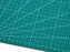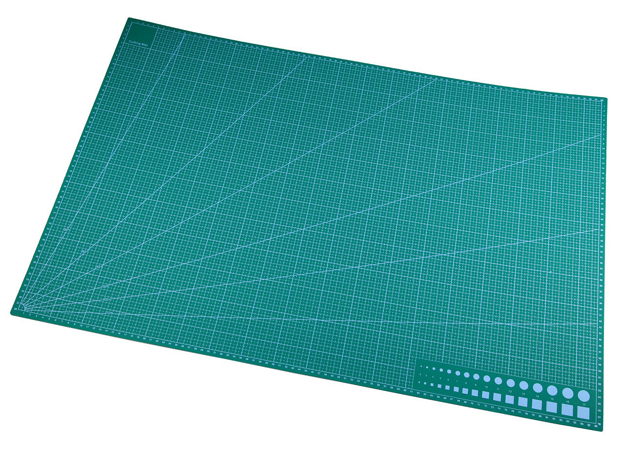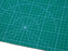 Na jedné straně podložky je vyznačená síť v cm. Druhá strana je rozměřená po 5 cm s úhly. Najdete na ní vzorkovnici průměrů kruhů, rozměrů elips, trojúhelníků a více úhelníků. Podkladová barva je zelená, linie jsou natištěné světle modrou barvou.