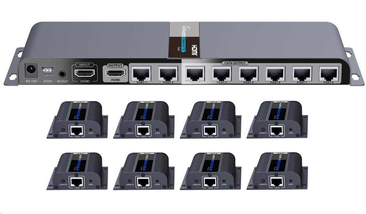 Můžete připojit až osm HDMI obrazovek k jednomu HDMI zdroji signálu po kabelu CAT6/6a/7.Extender se skládá z jedné vysílací jednotky s lokálním výstupem HDMI a osmi přijímači, které se propojí CAT6/6a/7 kabelem s vysílačem.Napájení přijímačů je prostřednictvím tohoto kabelu přímo z vysílače, nepotřebují napájecí adaptér.Splitter+extender umožňuje připojit až osm HDMI monitorů na vzdálenost 40m a zobrazit FULL HD 1080p