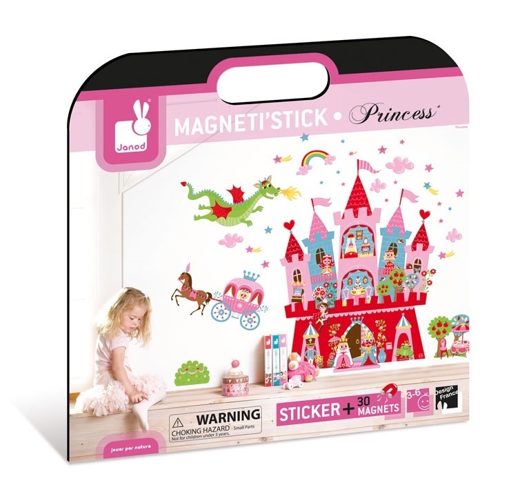 Velká podkladová magnetická samolepka se nalepí na stěnu a další malé magnetické samolepky (princezny, princ, král, královna, kočár, drak, hvězdy, a mnoho dalších tvarů) se mohou libovolně a opakovaně přemísťovat v okolí zámku, přesně tak jak Vaše malá princezna potřebuje.