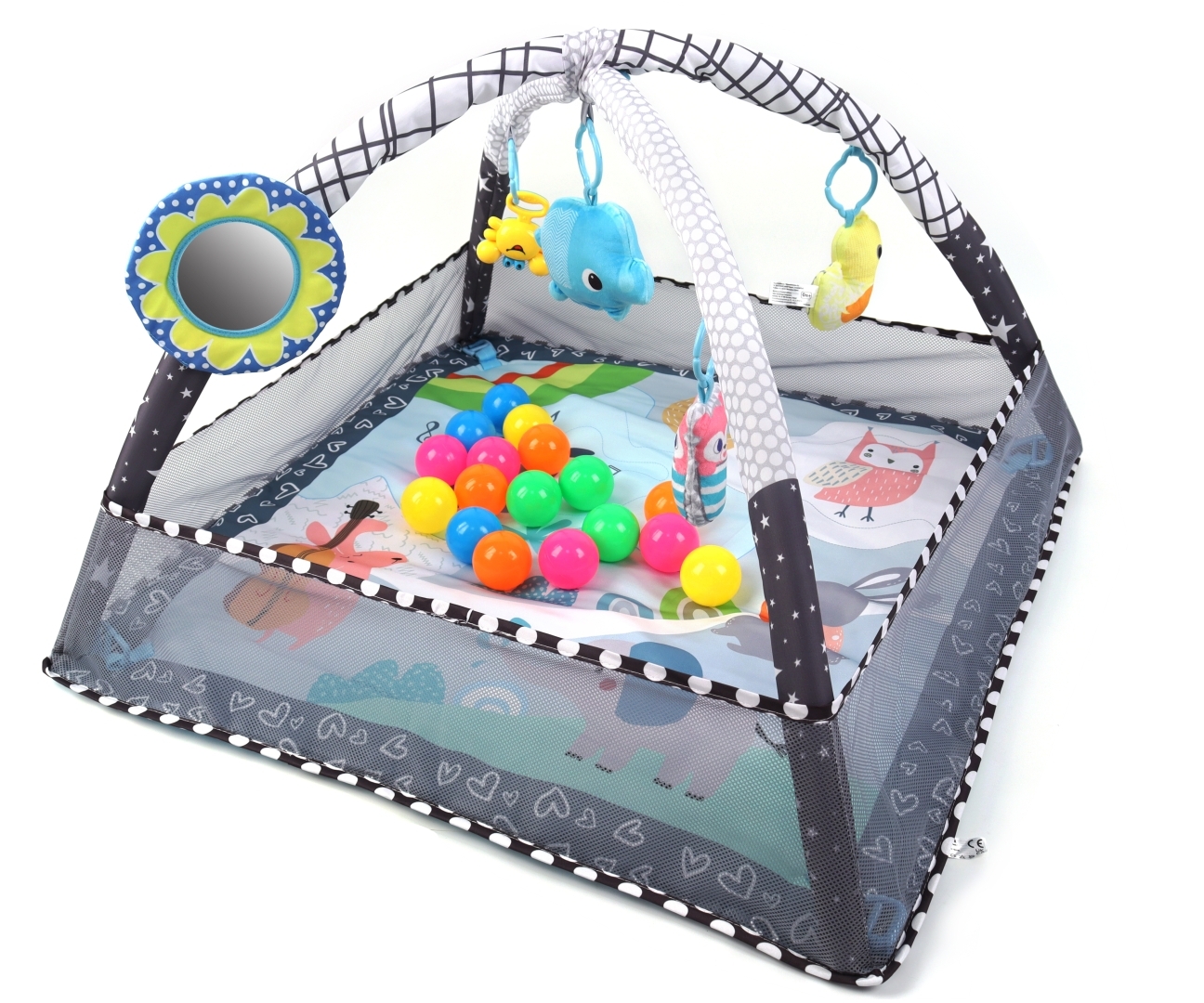 Podniesione ścianki z przewiewnej siatki przekształcają matę w bezpieczny kojec wypełniony 20 kolorowymi piłeczkami (w zestawie). Dziecko może bawić się w otoczeniu zabawek i miękkich ścianek, które zapewniają bezpieczeństwo i komfort.