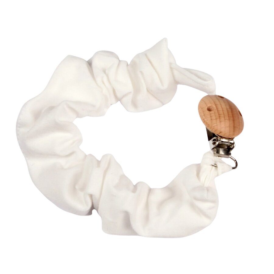 Materiałowa zawieszka do smoczka z drewnianym klipsem, wykonana z 96% bawełny i 4% elastan