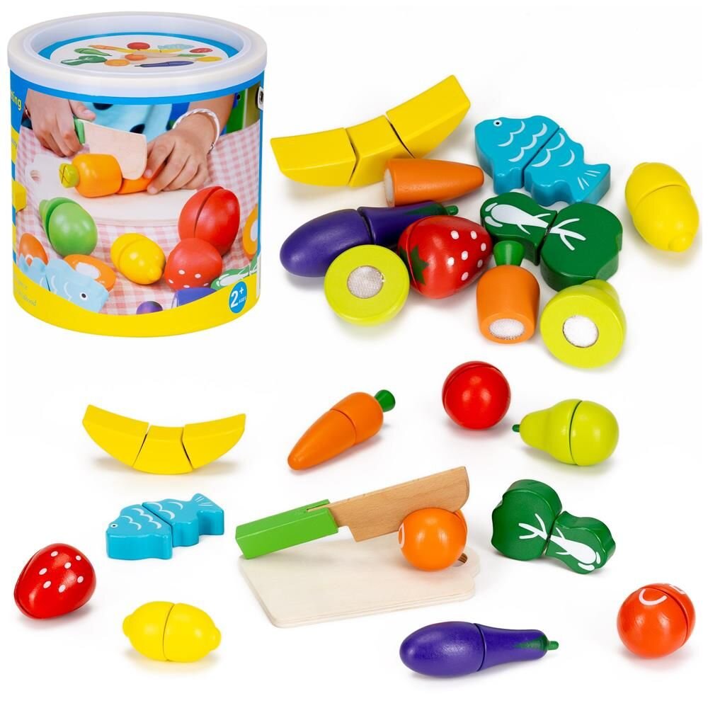V sadě děti najdou například banán, jahodu, rybu, mrkev, rajče, lilek, hrušku či brokolici, které mohou krájet pomocí dřevěného nože a prkénka. Hra rozvíjí jemnou motoriku, koordinaci rukou a očí i představivost. Celá sada je uložena v praktické krabičce s rukojetí pro snadné ukládání a přenášení. Vhodné pro děti od 3 let.